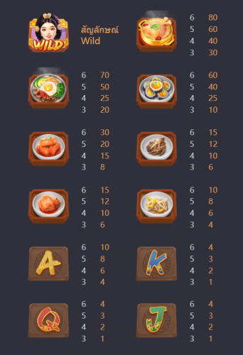 กิมจิ หากสะสมได้ 3, 4, 5, 6 อัน จะได้รับอัตราการจ่ายตามลำดับ 6, 10, 12, 15